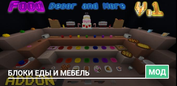 Декор из Блоков Еды и Другие Элементы — это декоративный аддон для Minecraft, который вводит 85 новых блоков, связанных с едой: пицца, тарелки, чашки, миски, столовые приборы, кухонные принадлежности и даже свадебный торт.