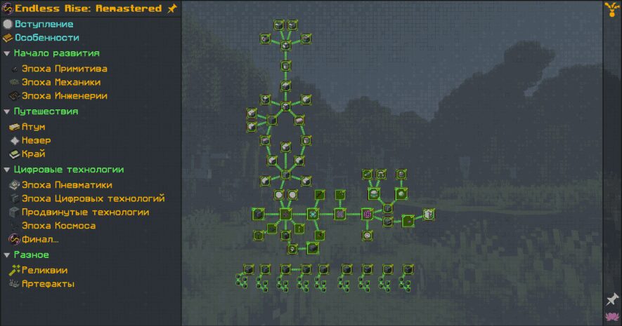 Вам предстоит пройти 18 этапов игры: начиная с добычи палок и камней, развивая множество механизмов и исследуя различные измерения, вы дойдёте до создания собственного космического корабля! Endless Rise: Remastered включает более 290 модов, которые связаны в единую прогрессию с 500+ квестами, 750+ переработанными рецептами и индивидуальными предметами. Спешите погрузиться в мир Бесконечного Развития!