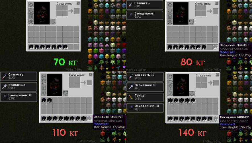 - PlayerWeight-1.6.3.1 (Добавление учёта веса игрока, возможность настроить каждому предмету свой вес и последствия, при превышении какого-либо значения веса игрока)